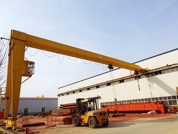 电动葫芦半门式起重机是有轨运行的中小型起重设备,主要由门架(主梁、支腿、下横梁等)、起升机构、运行机构及电控部分组成,以电动葫芦作为起升机构,工作时沿主梁工字钢下翼缘运行。门架一侧设有支腿,沿地面轨道上运行,另一侧无支腿,沿厂房上部轨道运行,其余结构和配置与MH型电动葫芦门式起重机一致。