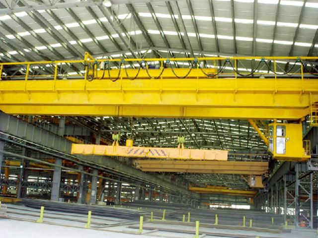 本起重机采用挂梁吊运长件钢坯、板材、棒材、盘圆等物品,配置电磁吸盘或夹钳或特殊群钩进行吊装,主要由箱形桥架、起重小车、大车运行机构、司机室和电气控制系统组成,配有停电保磁系统。起升机构多采用单电机、双减速器、双卷筒布置,呈双吊点形式。挂梁布置形式分垂直于主梁或平行于主梁两种。其余形式与QD型起重机相同。